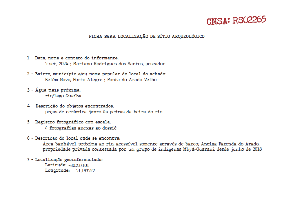 Here we propose imagining what the flooded areas of Porto Alegre might say. As a consequence of soil saturation—which occurs when land remains waterlogged for a long time—material traces, such as Mbyá-Guarani pieces, could come to the surface, making visible once again a past that resisted beneath our feet. The encounter with these traces would help confirm Indigenous presence in the region and, in this way, flooded areas could, in a sense, speak in favor of peoples in processes of reclamation, bearing witness to their millennia-long occupation.